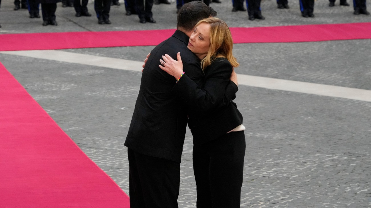 Nyitókép: Giorgia Meloni, olasz kormányfő (balra) és Volodimir Zelenszkij ukrán elnök 2025. december 9-én a római Chigi-palota udvarán.